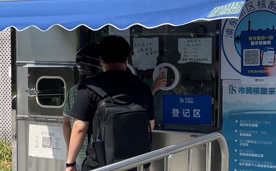 When you go up to the testing station, the first step is to have your nucleic acid code [核酸码] scanned. This is a QR code that you get from the health code app, and it contains your personal information.