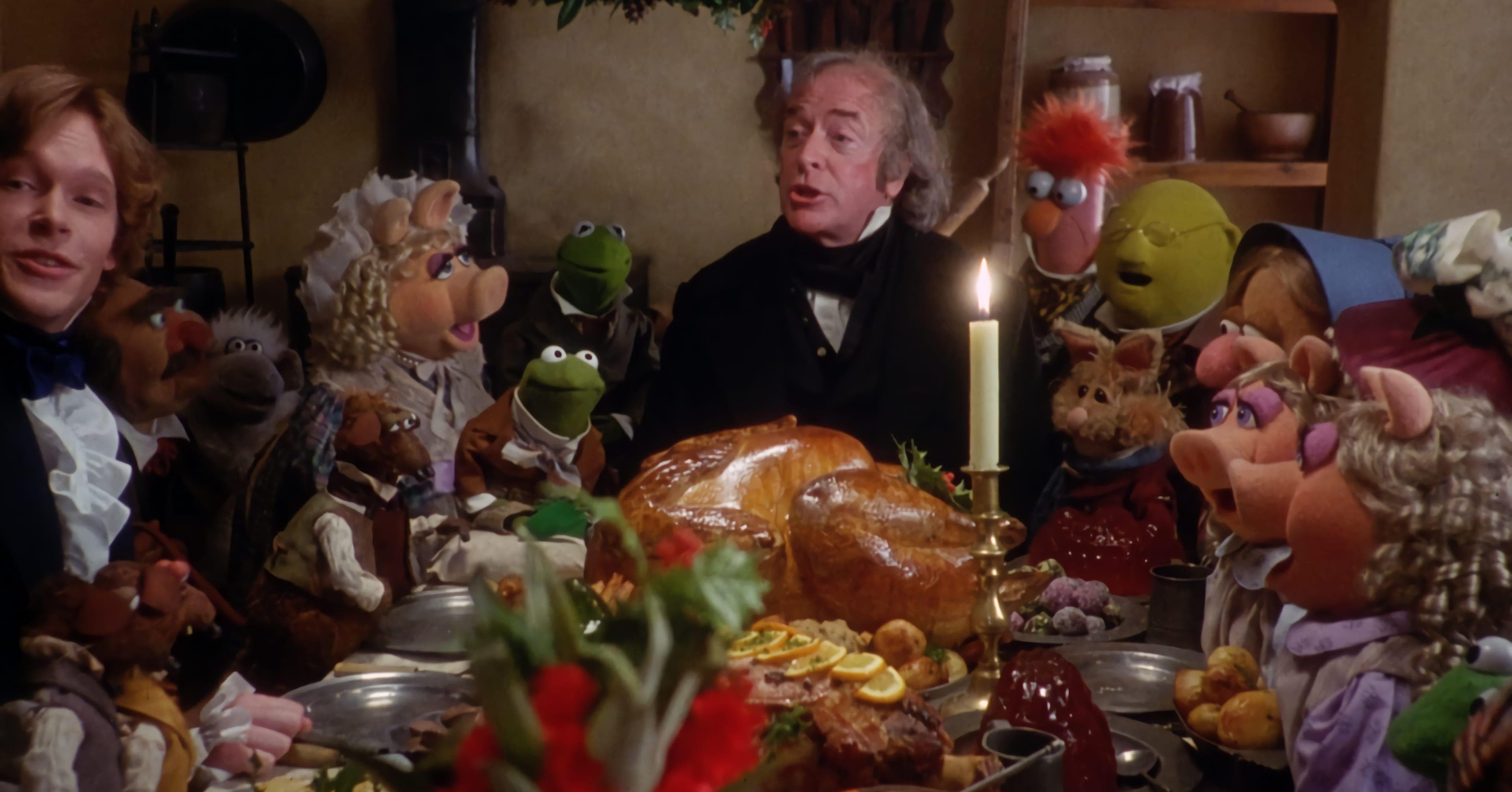 | Christmas dinner scene from "The Muppet Christmas Carol." Scrooge and a bunch of muppets are having dinner together. Image source. |